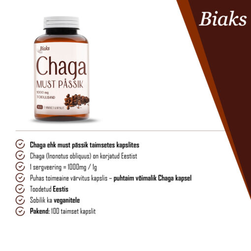 Koostisosad: Chaga (Inonotus obliquus) pulber, taimne kapsel (pullulaan).