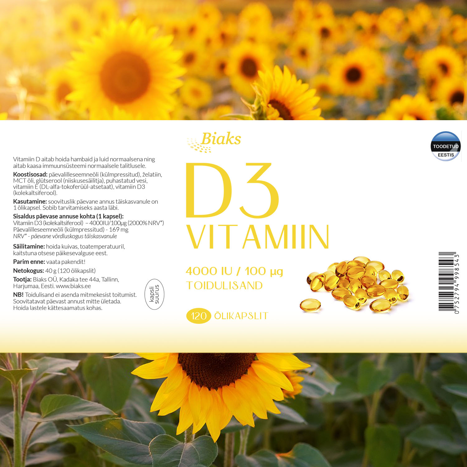 KOOSTISOSAD: päevalilleseemneõli (külmpressitud), želatiin, MCT õli, glütserool (niiskusesäilitja), puhastatud vesi, vitamiin E (DL-alfa-tokoferüül-atsetaat), vitamiin D3 (kolekaltsiferool).